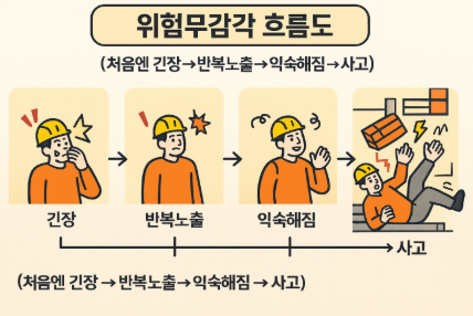 위험 무감각은 말 그대로 위험에 “무감각해지는 상태”입니다. 같은 위험에 여러 번 노출되다 보면, 처음에는 긴장하던 사람이 점점 위험을 대수롭지 않게 여기게 되는 현상을 말합니다.