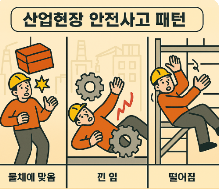 산업·건설·물류·서비스 현장에서 일어나는 안전사고를 살펴보면, 사고 유형은 계속 바뀌지 않고 그대로 반복되는 경우가 많다는 걸 알 수 있습니다. 추락, 끼임, 부딪힘, 전도 같은 사고가 매년 비슷한 방식으로 반복되죠.